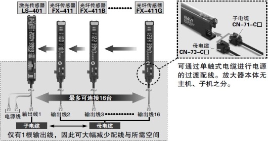連接器型(FX-411□、FX-412□)使用的是數字光纖傳感器FX-300系列等產品中采用的單觸式電纜。可與激光傳感器等混合使用,從而節省電源線。